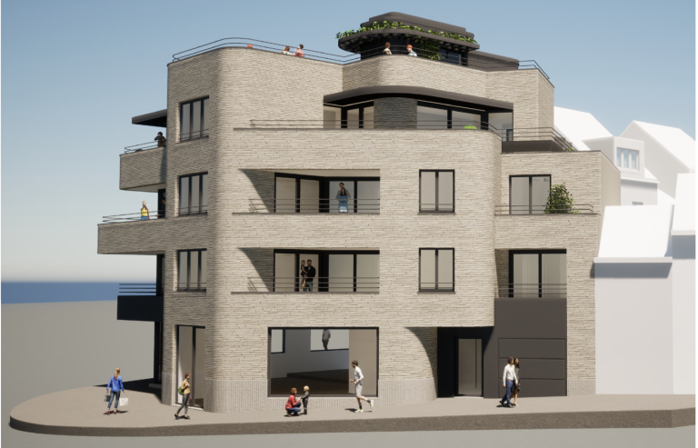 Construction d’un immeuble de 8 logements et 8 places de parking avec un rez-de-chaussée commercial. Il comprend 1 sous-sol, un rez-de-chaussée et 3 étages.
